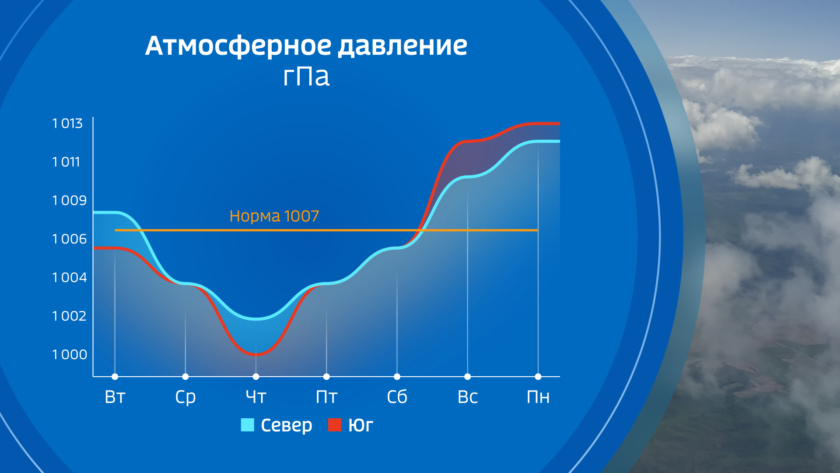 Что касается атмосферного давления, то его значения со вторника начнут медленно падать — фон до пятницы будет низким. В выходные дни давление будет быстро расти и выйдет за пределы нормы августа.
