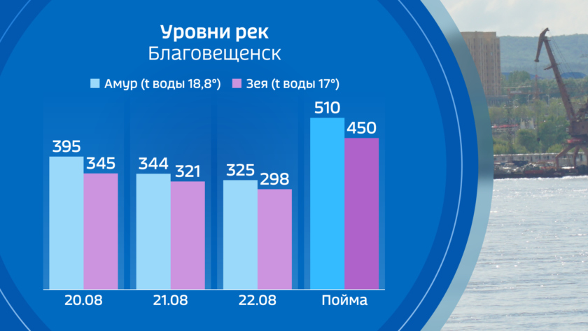 В районе Благовещенска с субботы по понедельник уровень Амура понизился на 70 см и продолжает падать. Температура воды 19 градусов. Уровень Зеи упал почти на полметра, температура 17 градусов.