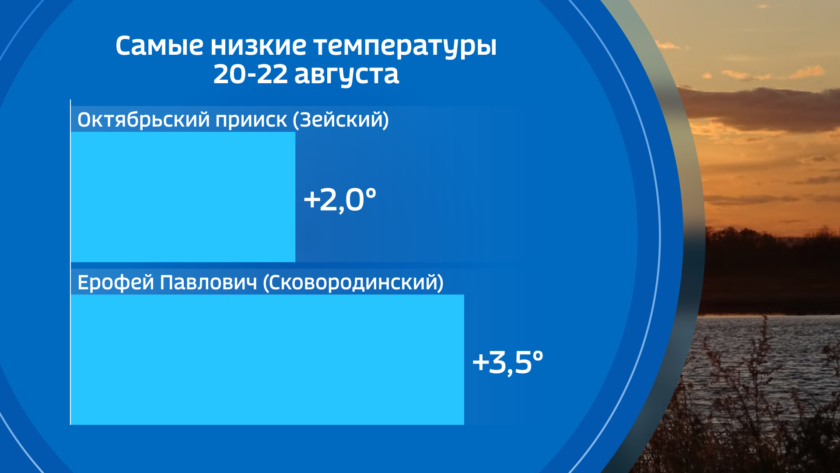 Температура ночью по области плюс 7-12, в Тындинском и Сковородинском районах к субботе понижения температуры до 0 — минус 2 градусов. Днем преобладающие температуры 13-19, по северо-западу местами до плюс 25.