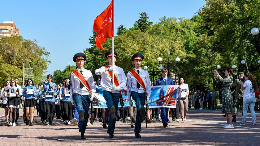 Участники церемонии собрались у мемориала, прошла минута молчания, прозвучал ружейный салют, после чего возложили цветы. Затем под звуки марша прошли воины Благовещенского гарнизона и военный оркестр, вслед за ними — школьники и студенты с фотографиями памятников и обелисков, построенных в честь советских солдат. В конце на набережной Амура горожане опустили на воду живые цветы в память о погибших.