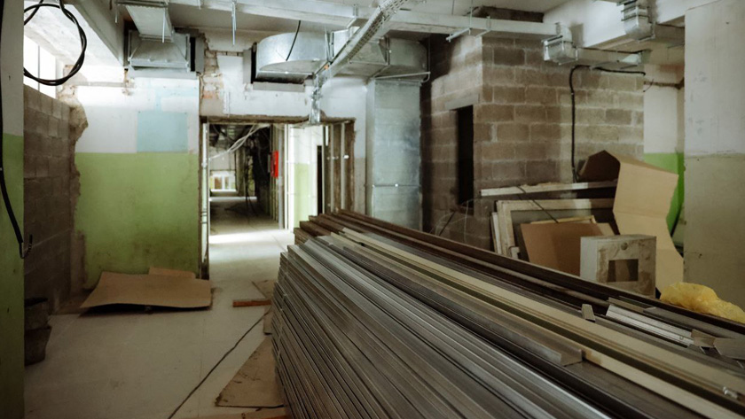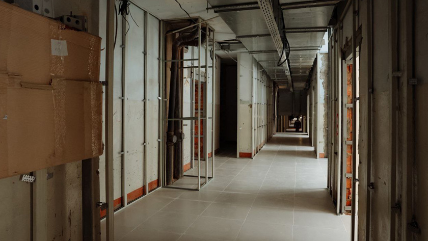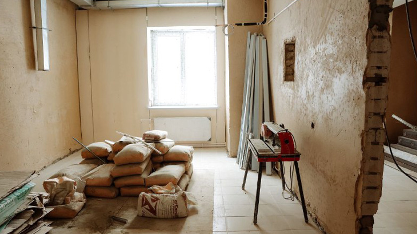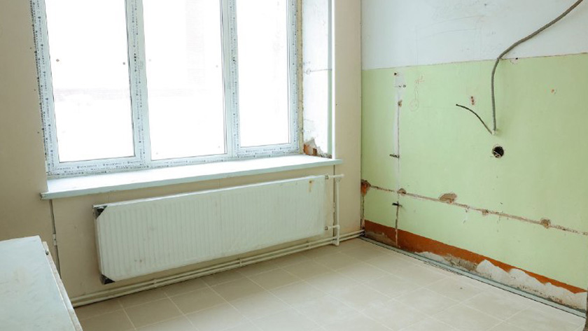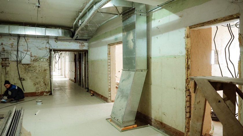 На сегодняшний день строители производят замену оконных и дверных блоков. Ремонтируют фасад и внутренние помещения учреждения здравоохранения. Пол облицевали керамогранитной плиткой, установили металлокаркасы для сборки панелей на стенах.