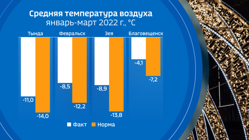 Итак, зима в 2022-м в области была с существенно повышенным температурным фоном. Средние температуры воздуха стабильно превышали норму на 2-3 градуса. Самой теплой, разумеется, по сравнению с обычными показателями, стала зима на северо-востоке области в Селемджинском районе и на востоке Зейского. На метеостанции Дугда — на 4-5 градусов теплее нормы весь сезон.