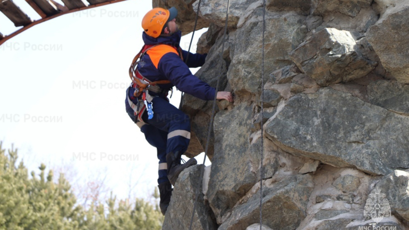 На скалодроме в экстрим-парке спасатели отрабатывали подъем пострадавшего на скалу в специальных санях и дальнейший спуск. Главная задача при прохождении таких тренировок — как можно быстрее выполнить задание, не допустив при этом ошибок и нарушений требований техники безопасности.