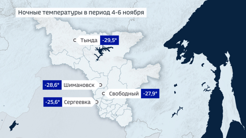 В первой декаде ноября зима настойчиво заявила о своем неминуемом наступлении. На 6 градусов ниже нормы опустился температурный фон. А в период с 4 по 6 ноября это отклонение составило 7-10 градусов. До минус 26-28 градусов доходили ночные морозы как на севере, так и в южных районах, а в Тынде было практически минус 30 градусов.