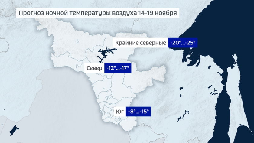 По предварительному прогнозу, на текущей неделе усиление морозов не ожидается. Первая половина будет очень комфортной — без осадков, скорости ветра небольшие. В четверг мы окажемся под влиянием северо-западной периферии очередного глубокого циклона, который будет смещаться вдоль побережья и принесет обильные осадки в Приморье, на юг Хабаровского края — здесь вновь ожидаются дожди, переходящие в снег.