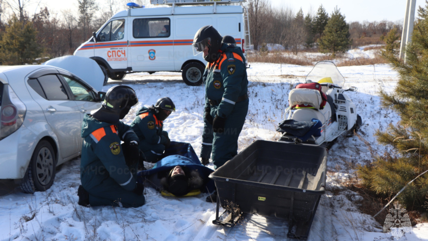 Из-за гололедицы на трассе водитель не справился с управлением и съехал в заснеженный кювет. К счастью, это всего лишь сценарий. Аэромобильная группировка регионального управления МЧС провела учения на случай возникновения нештатных ситуаций на дорогах Приамурья.