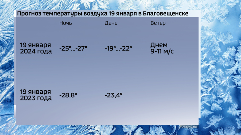 В столице Приамурья к утру 19 января усиление мороза до минус 25-27 градусов. Днем ветрено, термометры покажут минус 19-22 градуса. Для сравнения, в прошлом году в такую ночью в Благовещенске было почти минус 29, а днем столбик термометра не смог подняться выше отметки минус 23,4 градуса. Северо-западный ветер дул со скоростью 10 м/с, и в течение суток порошил снег.