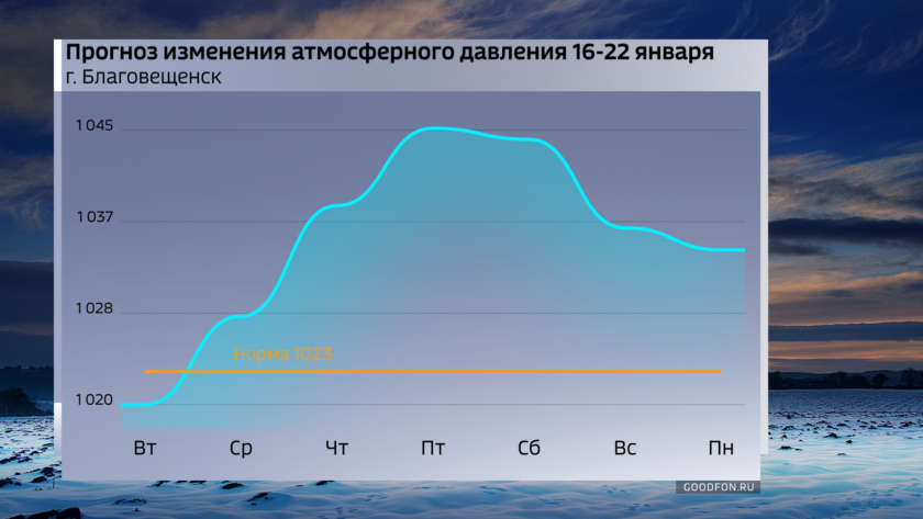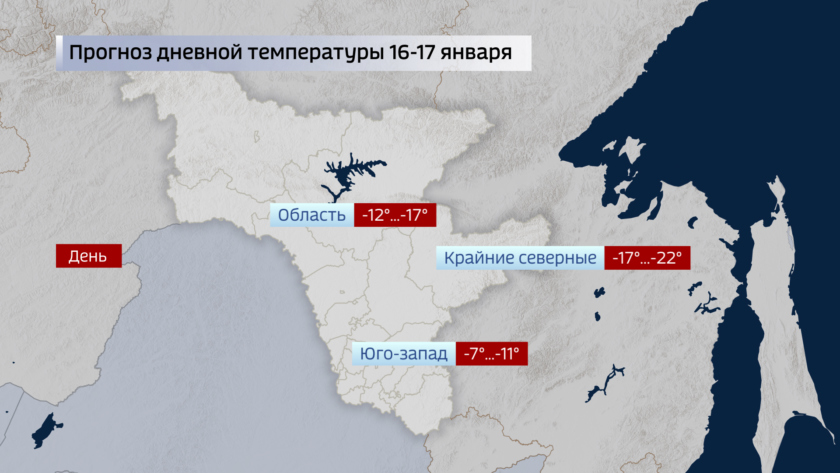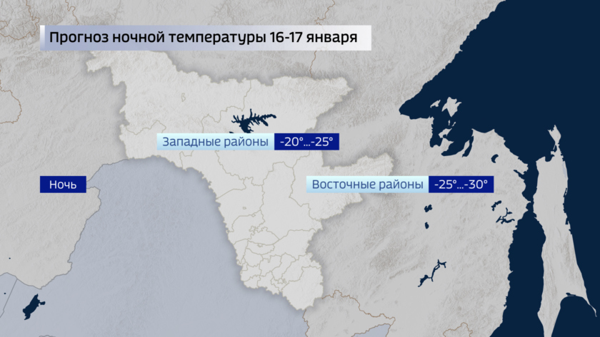 Отдельно скажем о пятнице 19 января, на нее придется один из главных христианских праздников — Крещение. По предварительным прогнозам амурская ночь обещает быть малооблачной, ветер тихим. Ночные температуры в северных районах от минус 33 до 41 градуса, на юге — в западной части около 25 градусов, на востоке до минус 30-32. Днем северный ветер усилится до 9-11 м/с. На севере температуры минус 23-28, по крайним районам около минус 30, на юге 19-25 мороза.