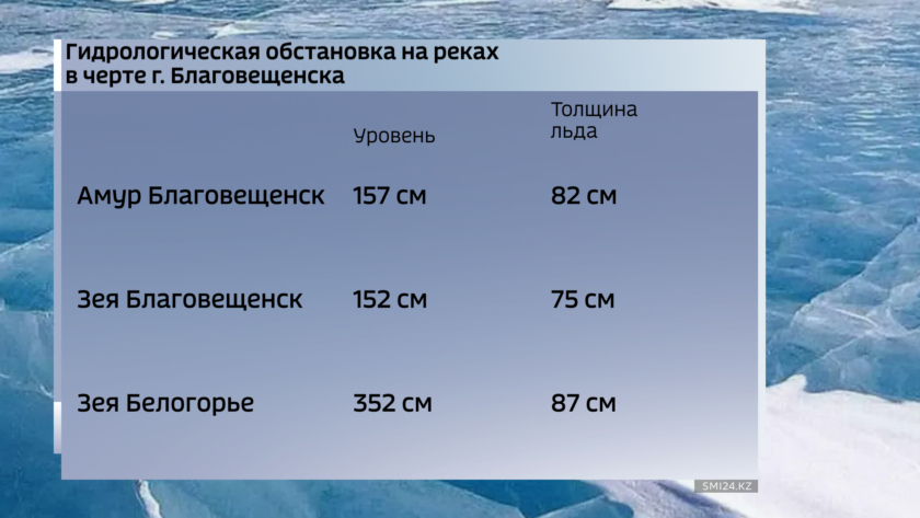 В районе города Благовещенска на Амуре уровень воды превышает норму почти на 121 см, на Зее в районе города выше нормы на 47, в районе Белогорья на 41 см. По данным на 10 января толщина льда в точке измерения на Амуре составляла 82 см, что больше нормы на 4 см., на Зее 75 см -это меньше нормы на 3 см, в Белогорье 88 см, больше нормы на 8 см.