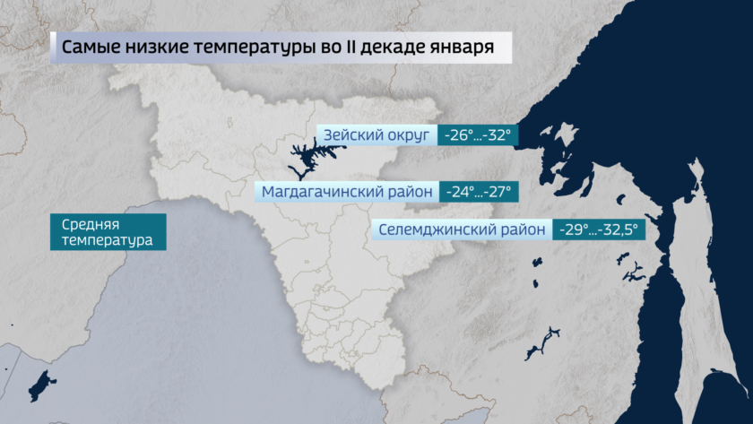 Что касается январских температур, то устойчиво низкие во второй декаде января они сохраняются в Зейском округе, где холоднее норм на 3-7 градусов, в Магдагачинском и Селемджинском районах, где температуры ниже многолетних значений на 2-3 градуса. На остальной территории температуры колеблются около норм с небольшими отклонениями, как в сторону холода, так и тепла. И повсеместно некомфортность погоде добавляет умеренный ветер северных направлений.
