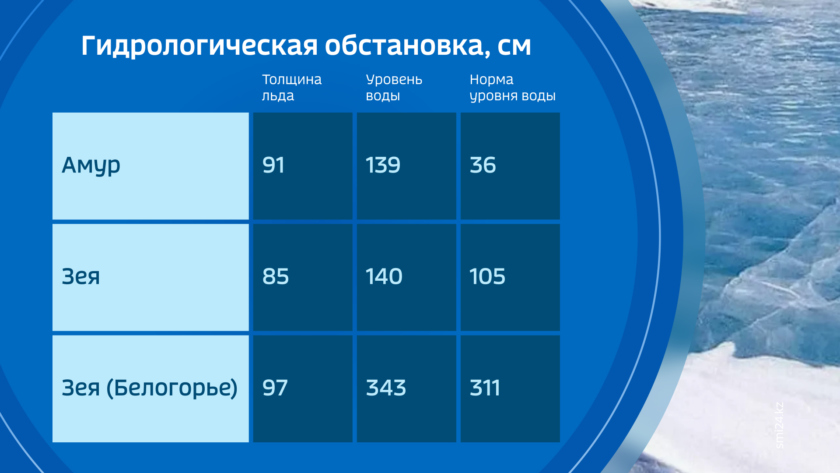 В районе областной столицы толщина льда близка к норме. На Амуре в точках измерения лед толщиной 91 сантиметр. Уровень воды на 103 сантиметра выше нормы. На Зее лед толщиной 85 сантиметров, уровень воды выше нормального на 35 сантиметров. У Белогорья лед толщиной 97 сантиметров, уровень воды выше нормы на 32 сантиметра.