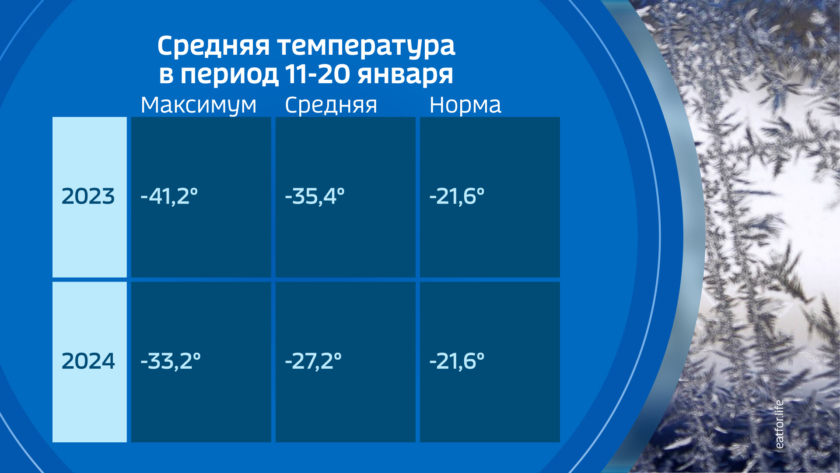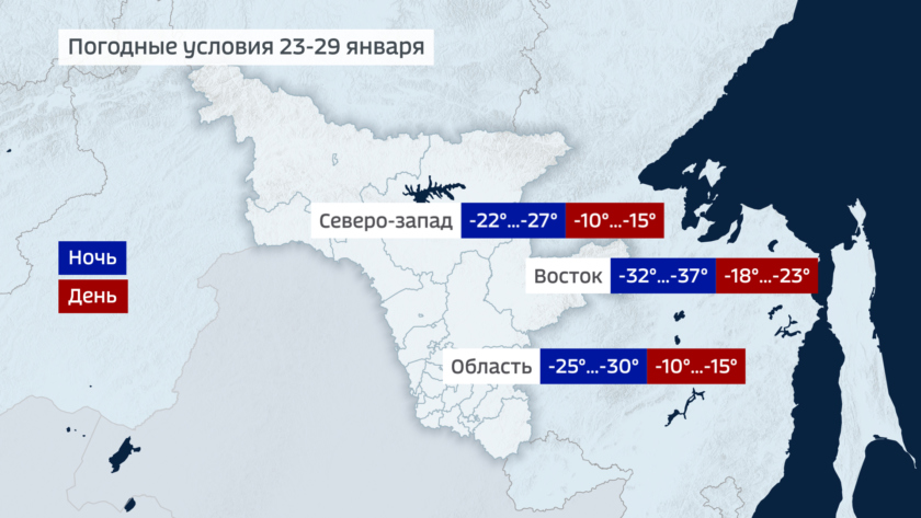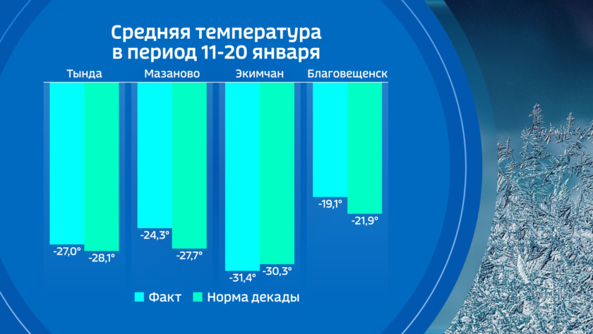 С 20 числа температуры воздуха в Амурской области понизились. Обычно этот период называют крещенскими морозами, но по сути это пик зимы. В этом году холода не такие суровые, как в прошлом. 21 января прошлого года минимальная температура местами по области достигала 50 и ниже градусов, а в Благовещенске впервые с 80-х годов 20 века упала ниже 40 градусов. Период 40-градусных морозов в столице области продолжался три дня. В этом году крещенский мороз не настолько суров, хотя среднесуточные температуры значительно ниже нормальных.