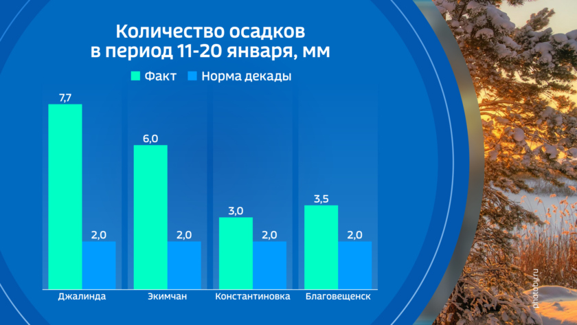 Осадки в течение декады шли неравномерно во времени и пространстве, за исключением 13-14 января. На старый Новый год в Амурской области действовал циклон, который обновил снежный покров по всему региону. В итоге количество осадков почти по всем метеорологическим станциям превысило небольшие климатические нормы. На большей части территории их было больше в полтора-два раза, самым снежным оказался северо-запад региона, где снега выпало в 3-4 раза больше положенного. Снежный покров постепенно увеличивается. Снег залегает ровно, и его высота составляет 8-20 сантиметров в долине реки и увеличивается до 30-40 с продвижением на север и восток.