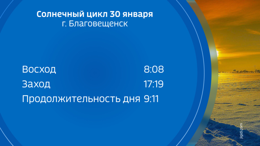 Световой день в своей продолжительности с декабря увеличился на один час 7 минут. 30 января на широте Благовещенска восход солнца в 8:08, заход в 17:19. Продолжительность светового дня 9 часов 11 минут.