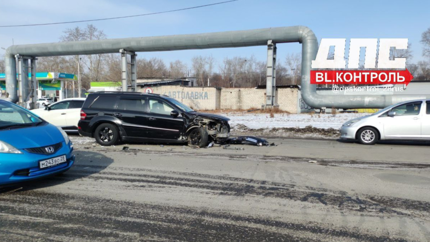 Как сообщили в городском отделе ГИБДД, столкнулись Mercedes-Benz, Toyota Progres, Nissan Atlas, Toyota Land Cruser Prado и SsangYong Rexton. Причиной массового ДТП стало несоблюдения дистанции.