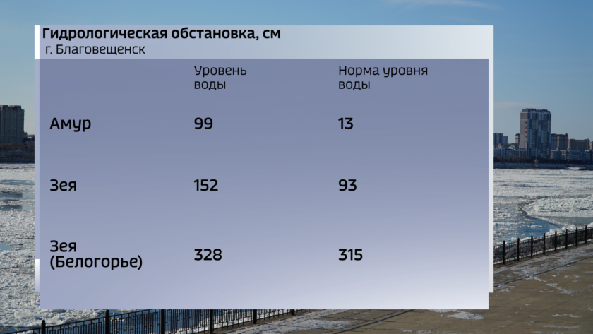 В районе областной столицы ровный ледостав. Уровень воды на Амуре 99 сантиметров, выше нормы на 86. На Зее уровень воды 152 сантиметра, выше нормального на 59, у Белогорья уровень воды в 8 часов утра составил 328 сантиметров, что выше нормы на 13 сантиметров.