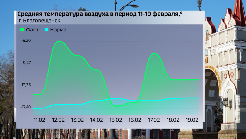 С учетом двух циклонов, прошедших на прошлой неделе, вторая декада февраля оказалась более чем снежной почти по всем районам Амурской области. Максимальное количество осадков зафиксировано в Константиновке, количество за декаду превысило норму почти в 10 раз, а норму месяца в 3 с лишним раза. В селе Усть-Нюкжа Тындинского округа за декаду снега было больше обычного в 8 с половиной раз. Много осадков было в Селемждинском районе и Зейском округе. В Благовещенске количество осадков за 10 дней превысило норму на 93 процента.