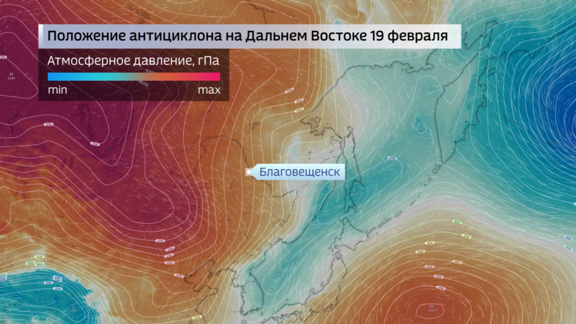 В понедельник вслед уходящему циклону вторгся холодный полярный воздух и сибирский антициклон уверенно усилился на всей континентальной части Дальнего Востока. Он будет определять погоду в течение всей недели и погодные условия можно охарактеризовать коротко: без осадков, солнечно и холодно.