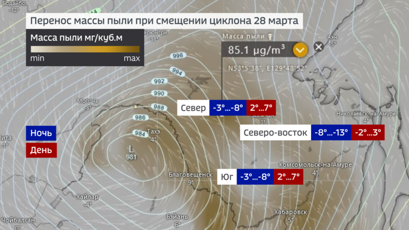 27 марта юго-западнее Амурской области мощный циклон в пустыне Гоби обусловил пыльную бурю. По мере смещения циклона огромные массы пыли и песка, поднятые с земной поверхности, с воздушными потоками понеслись на юго-восток и вместе с осадками выпали на территории Приамурья 28 марта. Такой процесс наблюдается у нас ежегодно, но зрелище было действительно необычное: серо-желтый воздух и ливень из песка и глины.