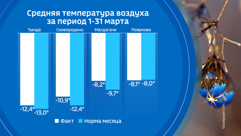 Первая половина марта текущего года была фактически бесснежной, но ровно с половины месяца ситуация кардинально изменилась. За 15 дней область пересекли три глубоких циклона, и общее количество осадков значительно превысило средние многолетние значения. 100 процентов климатической нормы отметили только в Архаре. Местами на юге региона осадков было больше на 20-40 процентов, но на большей части области их выпало больше в разы. Максимальное количество снега — в Тындинском округе.