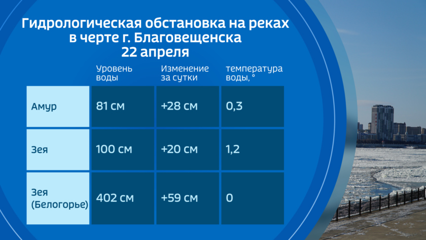 По состоянию на утро 22 апреля, продолжается вскрытие рек, с колебаниями уровня воды от 30 до 176 см. Водность Амура выше нормы от 40 до 70 см, у сел Гродеково, Поярково — около нормы. От Игнашино до Константиновки отмечается вода на льду, закраины, промоины. Ниже по течению — ледоход, навалы льда на берегах.