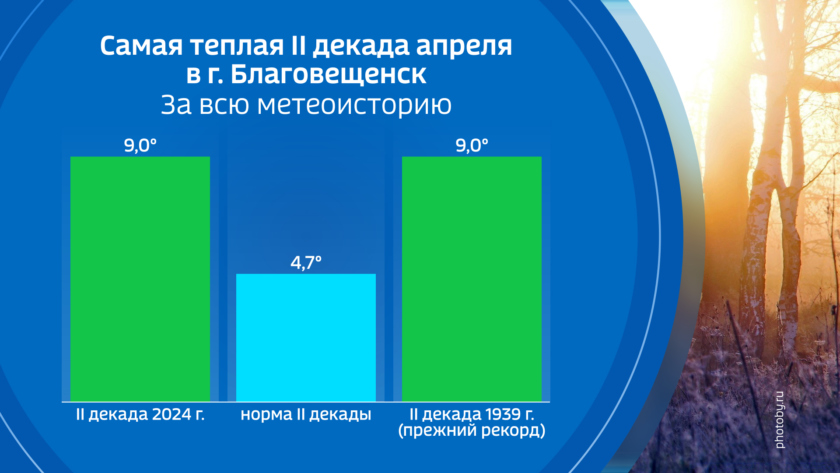 Плюс 9 градусов — таким оказалось значение средней температуры в Благовещенске при норме плюс 4,7 градуса. Так же тепло было лишь единожды, 85 лет назад, в далеком 1939 году. Кроме того, рекордно теплыми в столице региона были ночи 12 и 15 апреля, со значениями плюс 5,3 и 8,3 градуса соответственно, что на 1-2 градуса выше прошлых значений 1976 и 2003 годов. Рекордных дневных максимумов пока апрель не установил. Однако настоящие летние температуры до плюс 26-27 градусов днем 15 апреля зафиксировали на юго-востоке в Архаре и Малиновке.