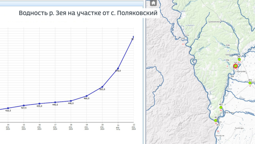 Водность Зеи выше нормы на участке от с. Поляковский в Зейском округе до Белогорья (устьевая часть) на 0,6-3,3 метра. На участке Ураловка — устье наблюдается вода на льду, закраины, промоины. Отмечается резкий подъем воды в районе Мазаново, Суражевки. У с. Мазаново подтоплена пойма на 62 см. В ближайшие дни (22-25 апреля) ожидается вскрытие реки Зея у села Мазаново, М. Сазанка — устье, с дополнительным подъемом уровней воды от полуметра до 2 метров, местами с достижением отметок неблагоприятного гидрологического явления (с. Мазаново неблагоприятное явление — 550 см).
