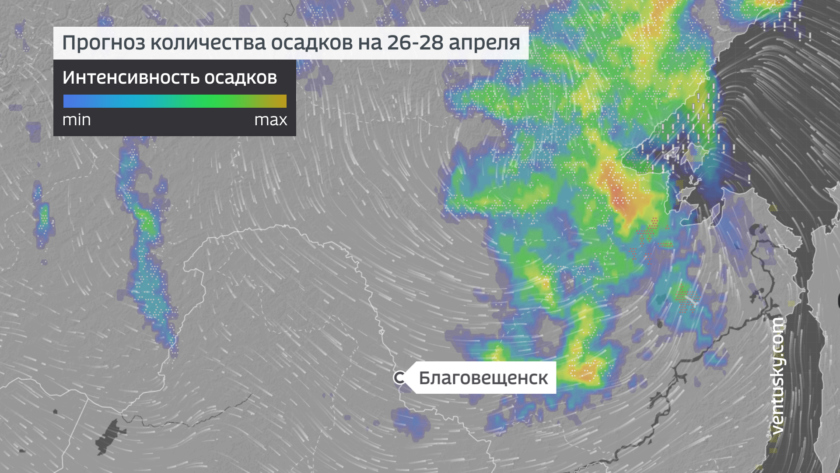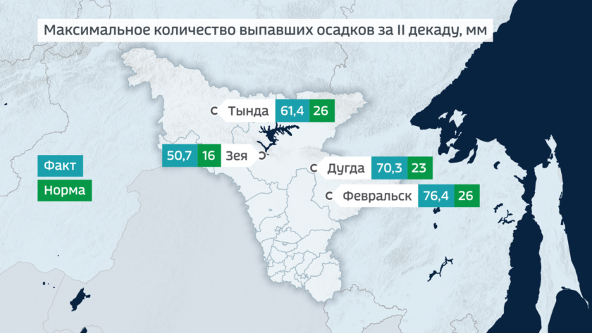 Что касается осадков, то во всех северных и восточных районах за декаду их выпало в количестве, значительно превышающем норму для всего апреля. Самые обильные — в Селемджинском районе, где циклоны оставили более двух месячных норм осадков, а также в Зее и селе Дугда, где за такой короткий период выпало более трех месячных норм.