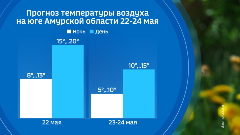 Во вторник к Приамурью выйдет северо-западный циклон. Неустойчивый характер погоды с дождями различной интенсивности, местами с грозами сохранится до четверга. Основные осадки во вторник и среду пройдут над крайними северными и восточными районами области. В среду и в ночь на четверг местами по северу не исключено выпадение зарядов дождя с мокрым снегом.