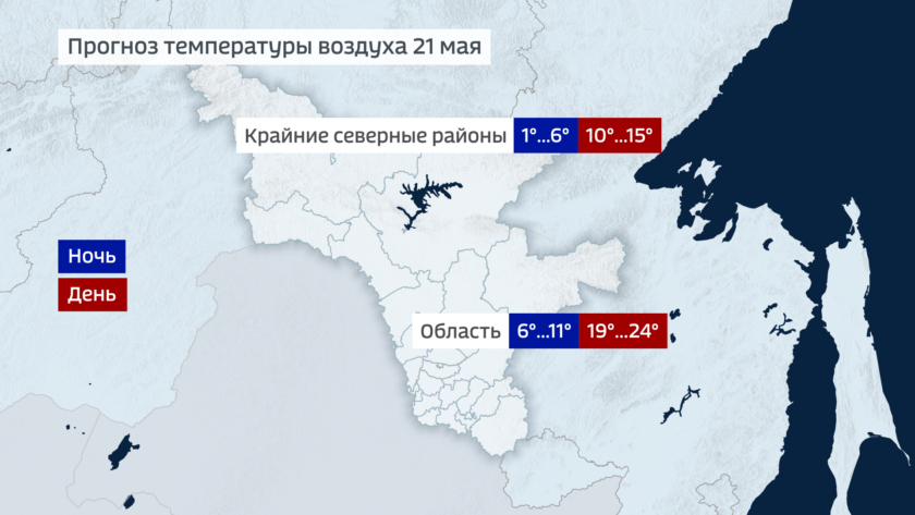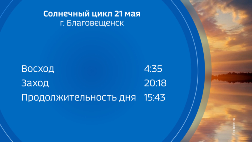 Восход солнца 21 мая на широте Благовещенска в 4 часа 35 минут, заход вечером в 8 часов 18 минут. Продолжительность светового дня составит 15 часов 43 минуты. За прошедшую неделю день прибавил к своей продолжительности еще 20 минут, а с начала месяца он стал длиннее на 1 час.