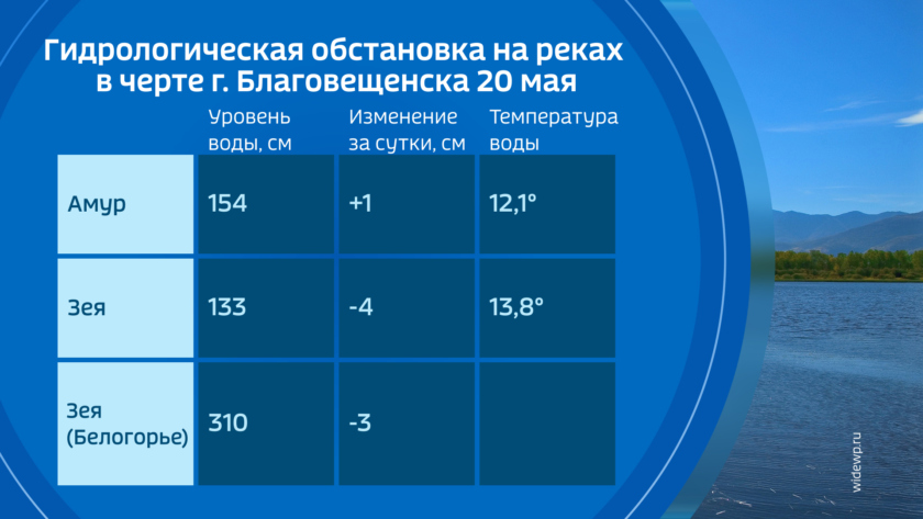 Гидрологическая обстановка на реках области сохраняется спокойной, реки находятся в коренных руслах. По состоянию на утро 20 мая водность Амура преимущественно пониженная, водность Зеи средняя. В ближайшие дни на реках ожидаются колебания уровней воды на 10-20 см в сутки. Водность реки Селемджа на участке Экимчан — Стойба повышенная. За сутки здесь отмечались колебания уровней от 20 см до полуметра. В ближайшие дни прогнозируется спад уровней на 10-40 см. На участке от села Норск до Усть -Ульмы водность реки средняя, за сутки уровни повысились на 20-40 см. В ближайшие дни ожидается подъем уровней на 10-50 см в сутки.