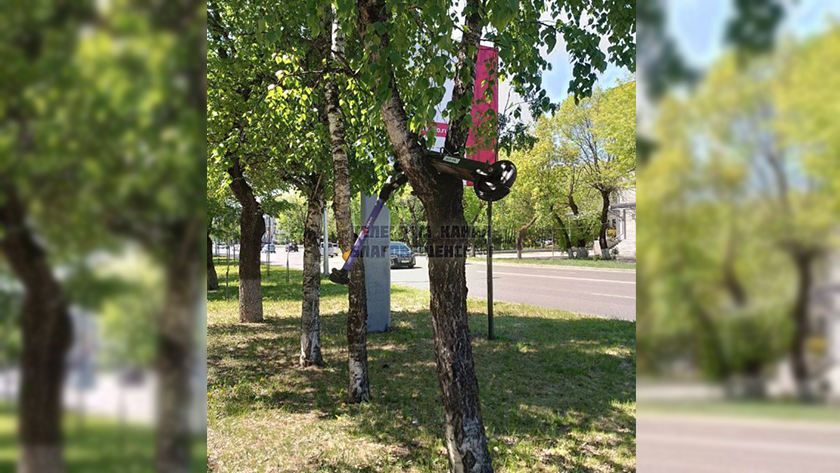 Еще один случай нарушения порядка обнаружили жители города в районе здания ДОСААФ. Фотографией поделились в одном из местных телеграм-каналов — неизвестные «припарковали» электросамокат прямо на дереве.