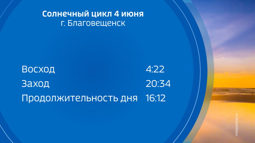 Восход солнца во вторник, 4 июня, в 4:22, заход в 20:34, продолжительность светлого времени суток 16 часов 12 минут.