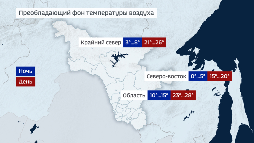 Ночью на большей части области 10-15 градусов, в крайних северных районах от 3 до 8, на крайнем северо-востоке в Селемджинском районе возможны околонулевые температуры. Днем 23-28, при грозе и в дожде 15-20, на крайнем северо-востоке 15-20 градусов – преобладающая температура днем.