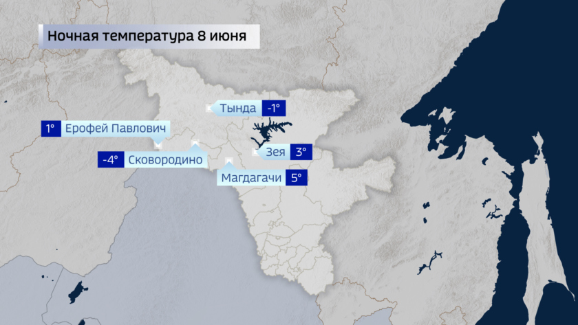 В прошедшие выходные, как и ожидалось, Приамурье пересекла очередная волна холода. Ночные температуры по области составляли от 5 до 11 градусов тепла, а вот в Тындинском и Сковородинском округах они опускались до 0…+3 градусов. В Тынде и Сковородине подморозило до -1…-4 градусов. Такие температуры на северо-западе в первой декаде июня явление не редкое.