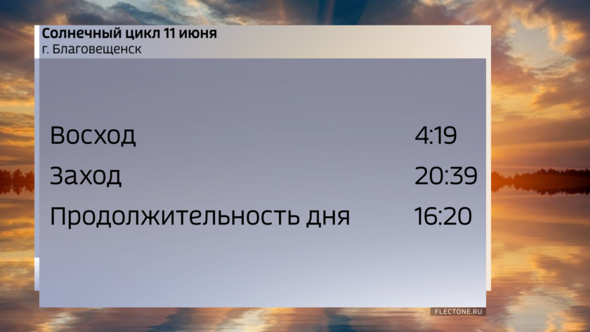Восход солнца 11 июня на широте Благовещенска в 4 часов 19 минут, заход вечером в 8 часов 39 минут. Продолжительность светового дня с начала лета увеличилась еще на 13 мин и составит 16 часов 20 минут.