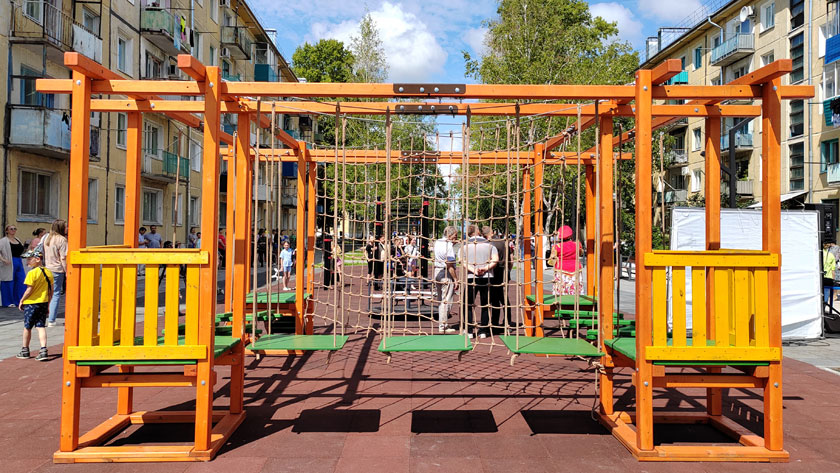 Объект между двумя многоэтажками «Автобата» возвели за три месяца. Дизайн-проект разрабатывали с учетом пожеланий местных жителей. На почти двух тысячах квадратных метров появились веревочный городок, воркаут-комплекс, качели и горки для дошколят, лавочки для старшего поколения. Также на придомовой территории провели освещение, уложили дорожки и безопасное резиновое покрытие на детском городке, забетонировали проезд. Открытие прошло с аниматорами, шоу мыльных пузырей и воздушных шаров, аквагримом и поздравлениями от первых лиц города и области.