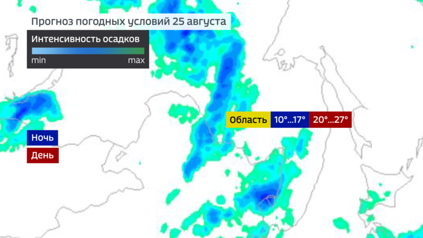 На текущей неделе погодных потрясений в Приамурье не ожидается. Во вторник под действием антициклона — без осадков. Ветер преимущественно слабый. Температура ночью 8+13, днем 23+28 градусов. А в среду и четверг мы косвенно окажемся под влиянием северо-западной периферии глубокого циклона, смещающегося по Приморскому краю. По предварительным прогнозам, на территории нашей области, в южных и восточных районах, небольшие и умеренные дожди начнутся вечером в среду и сохранятся в течение четверга. Кратковременные дожди также ожидаются на северо-западе области.