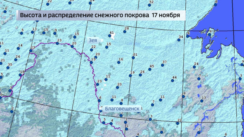В пятницу на территорию области вышел очень глубокий для ноября циклон, который принес большое количество снега, местами сравнимое с нормой декады по всему региону, за исключением Тындинского округа. Сумма осадков за сутки составила от 1 до 8 мм, максимальное количество снега, местами в два раза больше декадной нормы, досталось центральным районам области и ее столице.