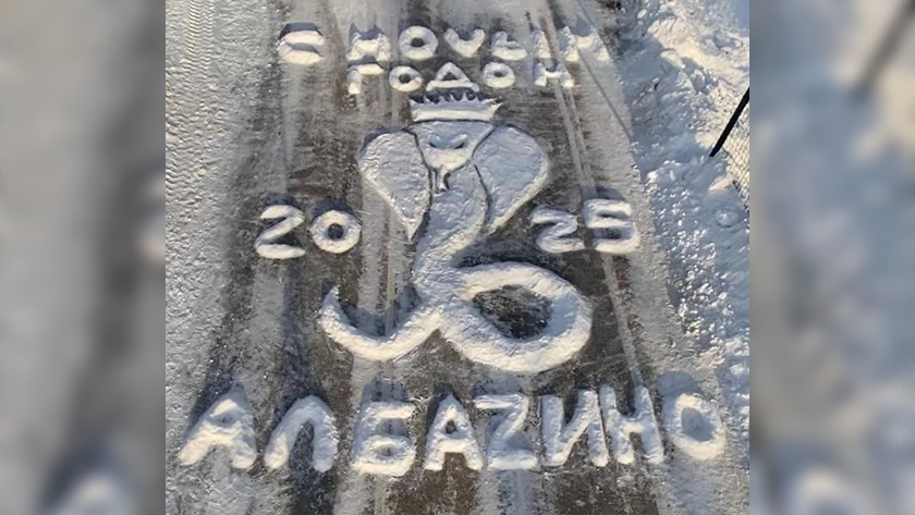 На своей огромной открытке из снега албазинцы изобразили змею — символ 2025 года по Восточному календарю. А в подписи одну из букв заменили на Z, в знак поддержки бойцов СВО.