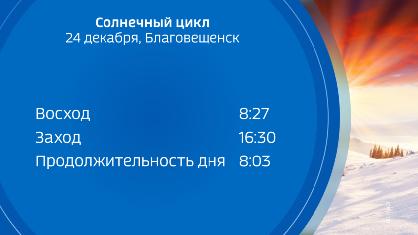 24 декабря восход солнца на широте Благовещенска в 8 часов 27 минут, заход в 16:30. Продолжительность светового дня, как и накануне, составит 8 часов 3 минуты. А с четверга 26 декабря день станет длиннее на 1 минуту.