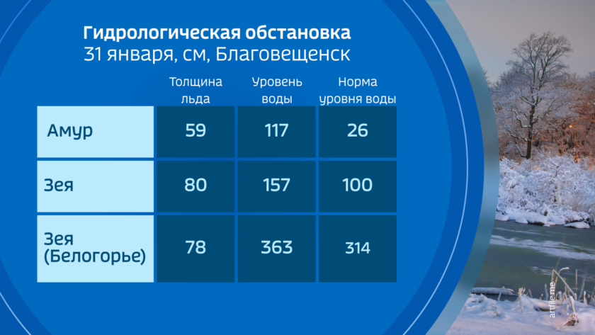 Толщина льда продолжает нарастать, она составляет 59-115 сантиметров, что меньше нормальной от 9 до 35 сантиметров. По состоянию на 31 января, в районе областной столицы толщина льда на Амуре составляет 59 сантиметров, ниже нормы на 35. Уровень воды выше нормы на 91 сантиметр. На Зее лед толщиной 80 сантиметров, уровень воды повышен на 57, у Белогорья лед на 19 сантиметров меньше нормы, уровень воды больше на 49.