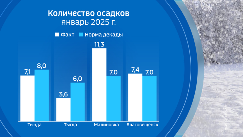 Снега за месяц выпало в пределах и чуть меньше климатической нормы в западной и центральной части региона. На юге и востоке осадков было больше, максимальное количество отметили на крайнем юго-востоке области. Больше всего снега в процентном отношении выпало, по данным метеорологических наблюдений, в селе Малиновка вблизи поселка Новобурейский.