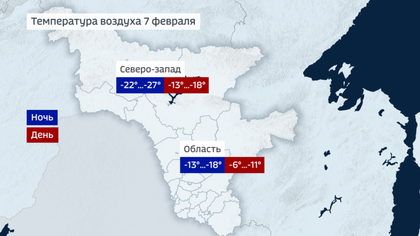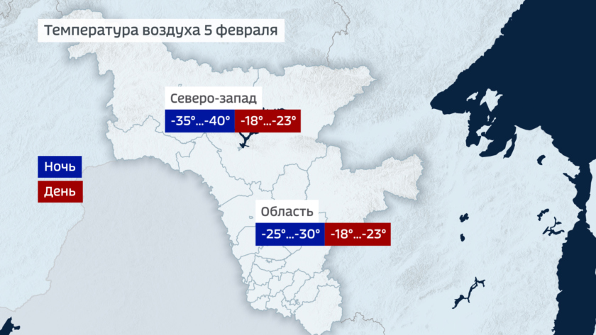 В пятницу относительно теплый воздух распространится почти на всю область за исключением Сковородинского и Тындинского округов. Ночью на большей части региона 13-18 градусов мороза, днем 6-11. Смена воздушных масс будет сопровождаться усилением северо-восточного ветра в порывах 10-13 метров в секунду.