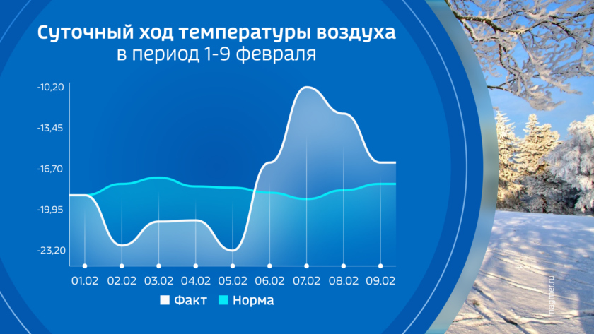 После четырех холодных дней 2-5 февраля в области резко потеплело, а 7-го средняя температура суток в Благовещенске оказалась на 9 градусов выше нормы. Максимальная температура была не особенно впечатляющая — 7,4 градуса мороза, а вот минимальная отметилась рекордом.