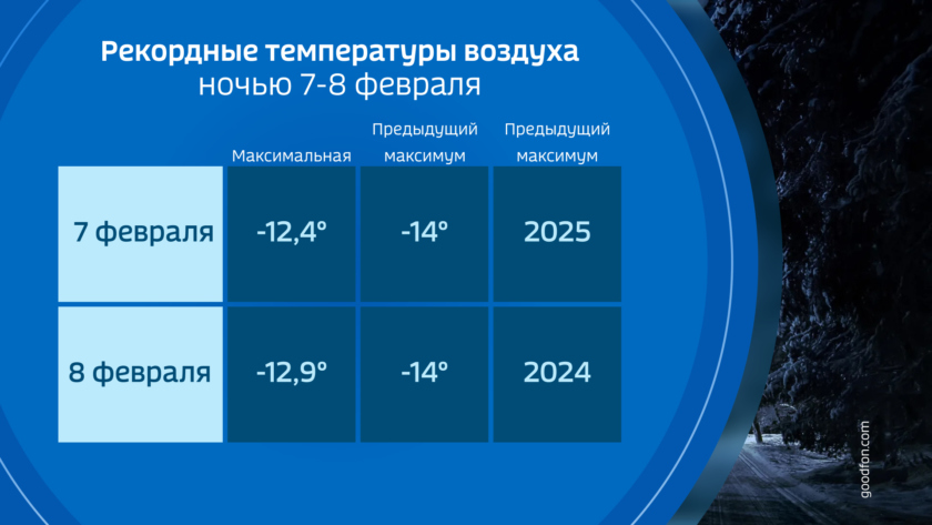 В ночь на 7 февраля температура воздуха в столице области опустилась всего чуть ниже 12 градусов, и для этих суток стала рекордной. До сих пор самой теплой на эту дату считалась ночь в 2002 году с температурой 14 градусов мороза. Интересно, что в прошлом году всплеск ночной температуры был почти в то же самое время — в ночь на 8 февраля.