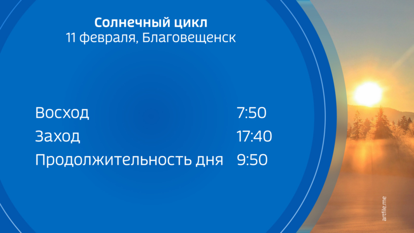 Восход солнца во вторник, 11 февраля, в 7:50, заход в 17:40. Продолжительность светлого времени суток 9 часов 50 минут. За неделю световой день прибавил еще 24 минуты.