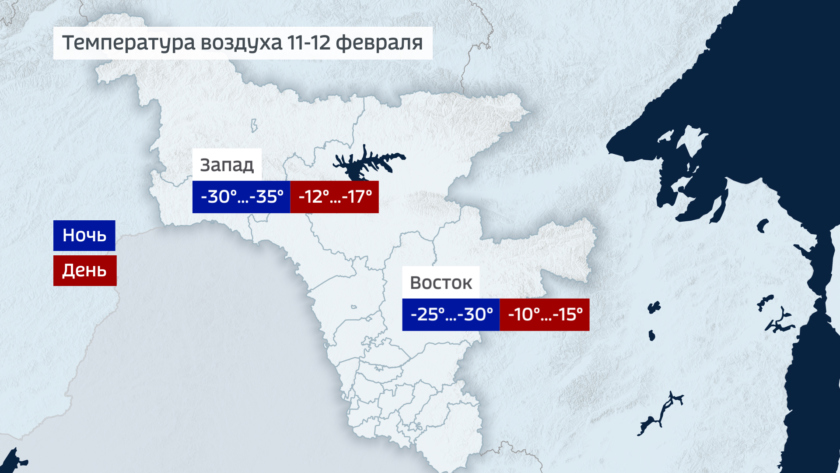 Во вторник и среду довольно холодно, ночная температура на западе области 30-35 градусов мороза, на востоке -25-30. Днем во вторник около -15 градусов, в среду местами чуть теплее от -15 до -10.