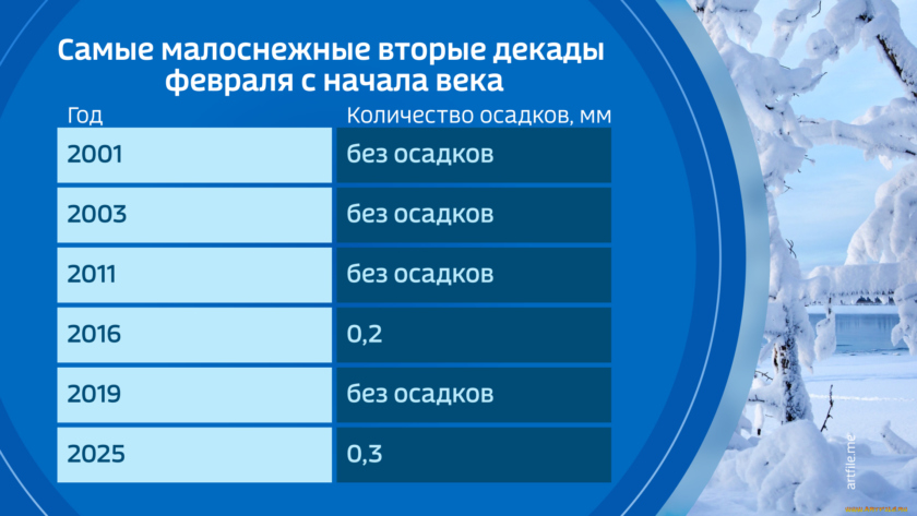 Столица региона оказалась в списке лидеров малоснежных вторых декад с начала века. Лишь в прошлый понедельник город припорошило снегом: на каждый квадратный сантиметр поверхности почвы упало 0,3 мм осадков, что составляет 10 % от нормы декады.