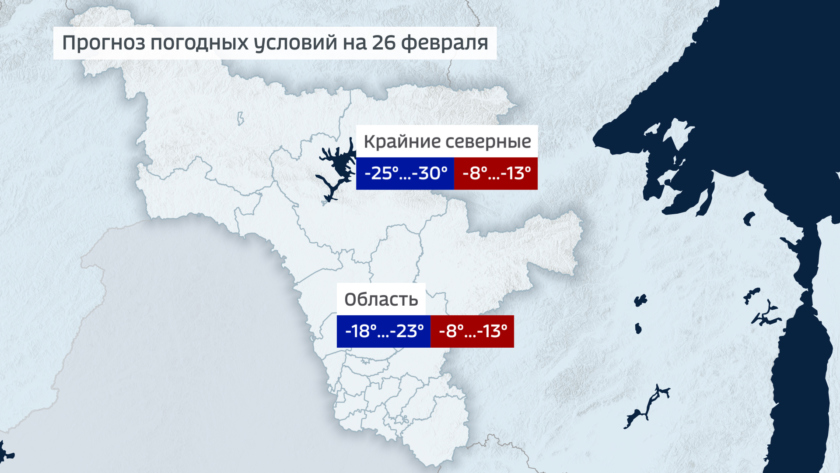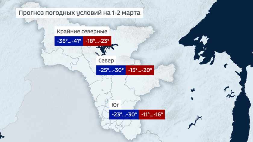 Что касается температуры воздуха, то она опустится ниже климатических норм. На севере ночью — -25-30 °C, по крайним районам — до -36-41 °C; на юге в субботу ещё -22-27 °C, в воскресенье уже уверенные -25-30 °C мороза. Днем на севере — -15-20 °C, на юге — -11-16 °C.